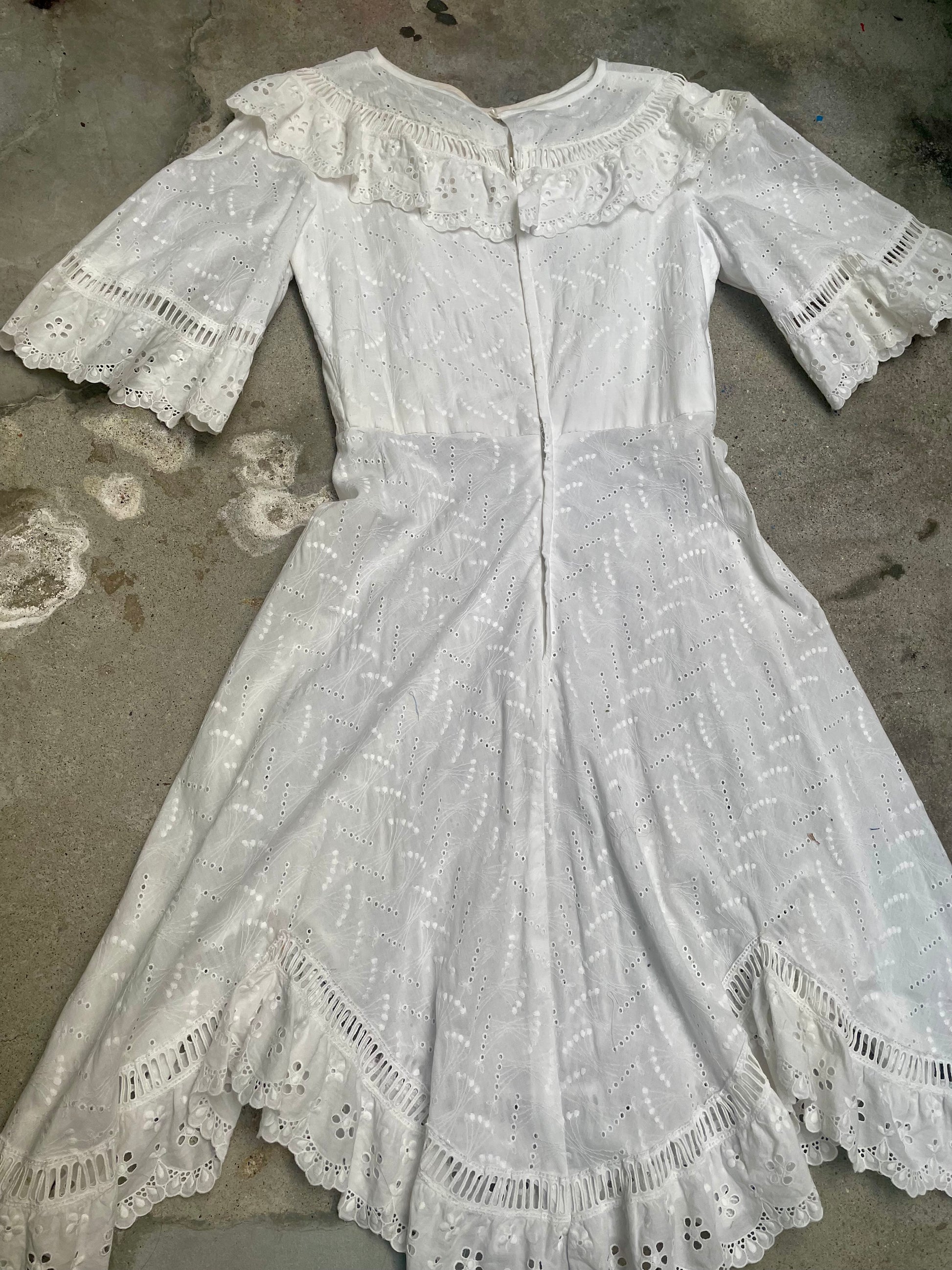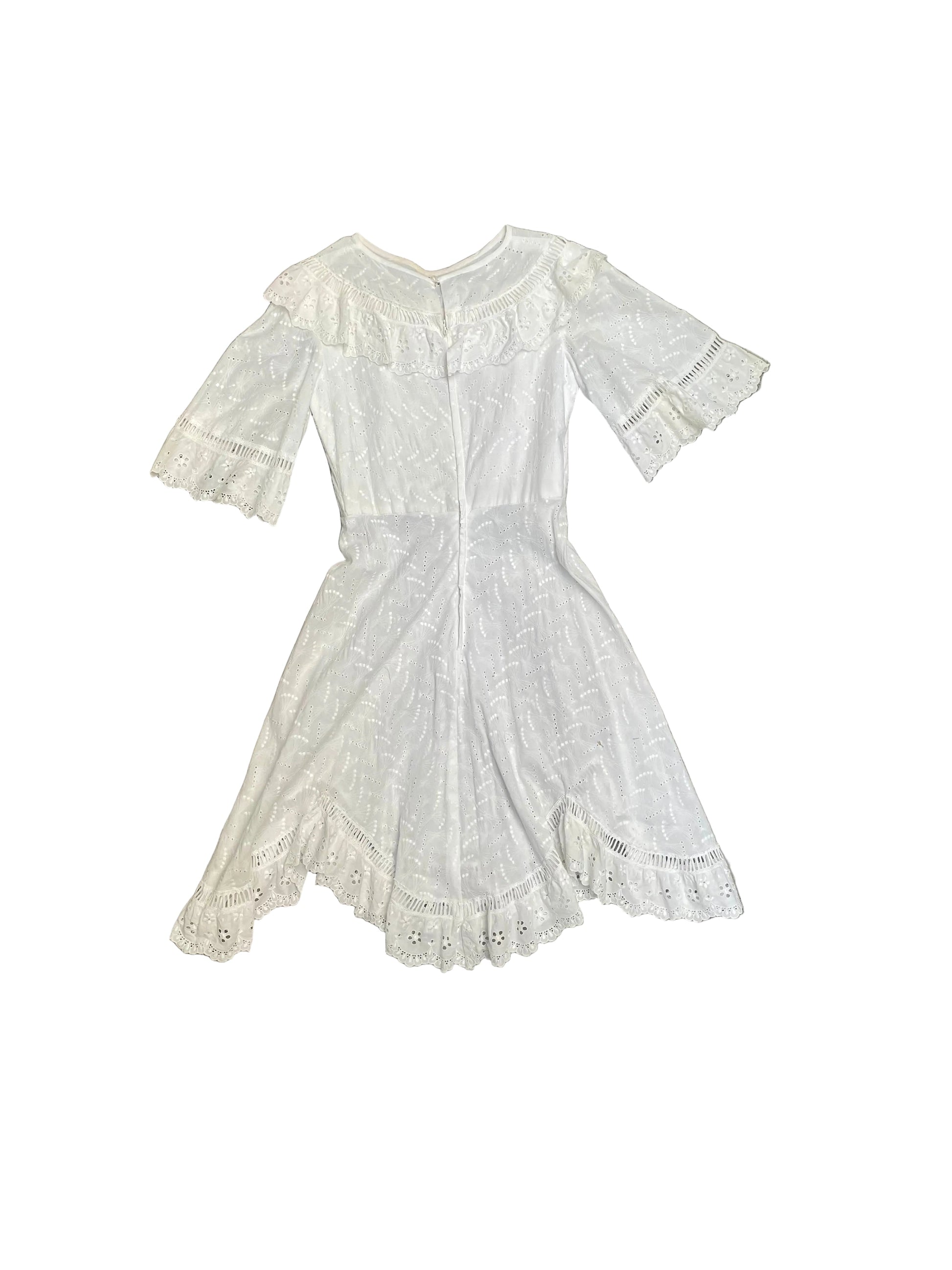 This beautiful vintage white dress is crafted from euro cotton, Made in France. Originally a wedding dress, it has been carefully redesigned so it can be worn on any occasion, while keeping all the romantic charm of the original piece. The delicate eyelet embroidery, soft ruffles, and flared sleeves give it a refined boho look inspired by the 70s, without being tied to a specific era.