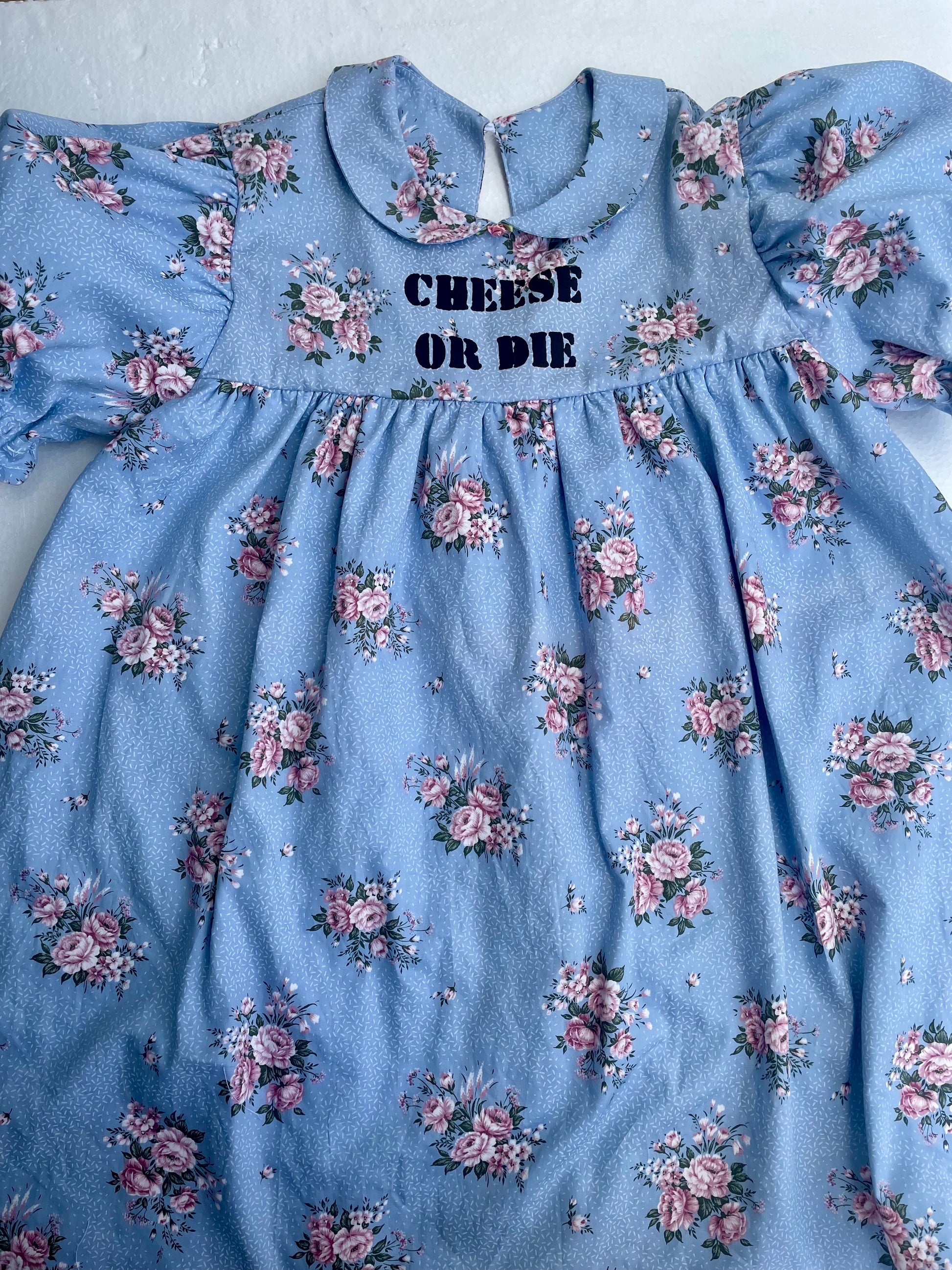 Details: Material: 100% cotton (from vintage bedsheet). Peter Pan collar and puff sleeves. Button closure at the back. Loose, comfortable fit. “CHEESE OR DIE” hand-printed on the chest. Fully lined.