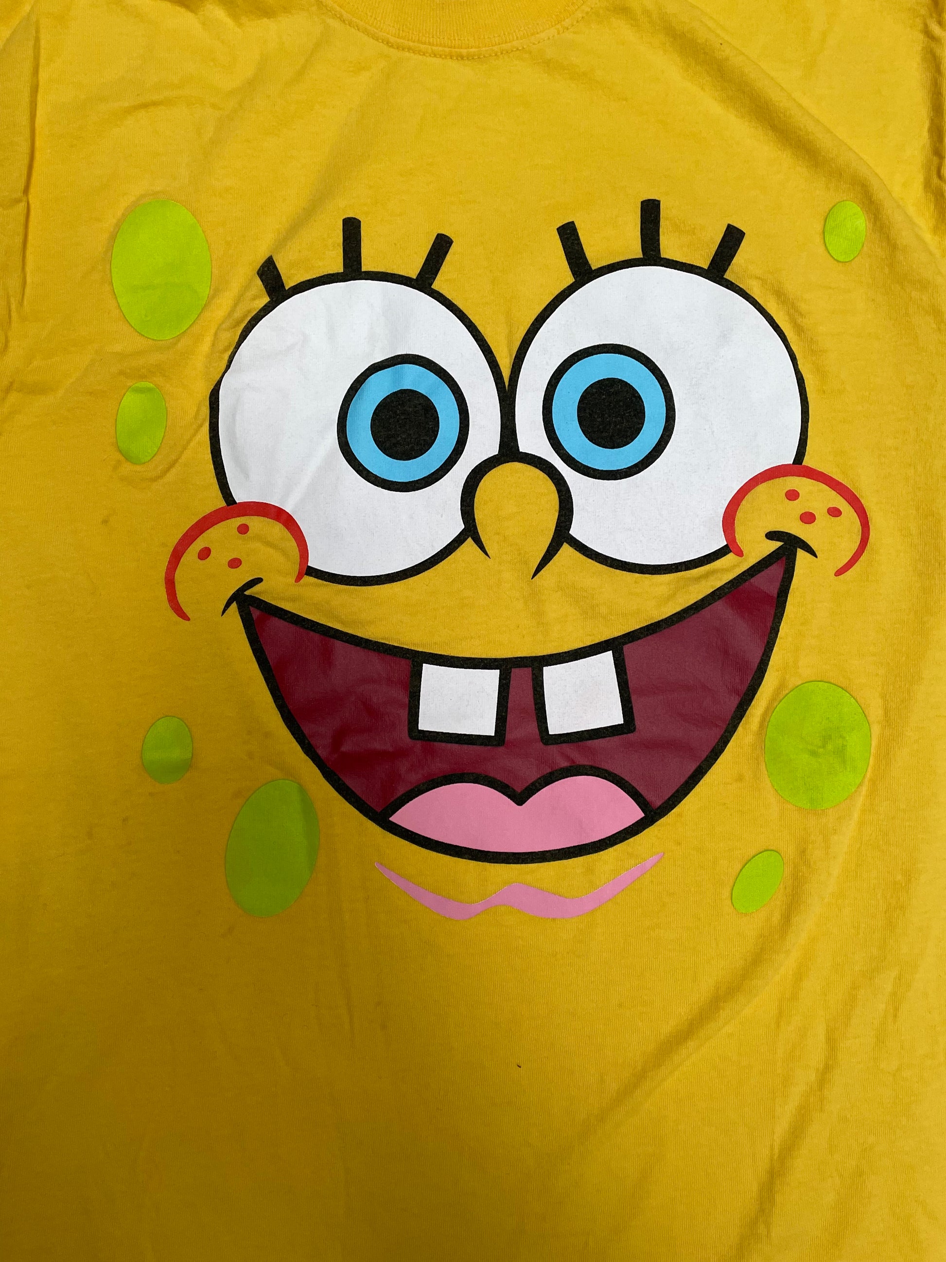 Bright yellow SpongeBob T-shirt featuring an iconic and joyful front print. A fun statement piece, perfect for elevating a simple outfit or creating contrast when styled with leopard-print trousers for a bold, fashion-forward silhouette.