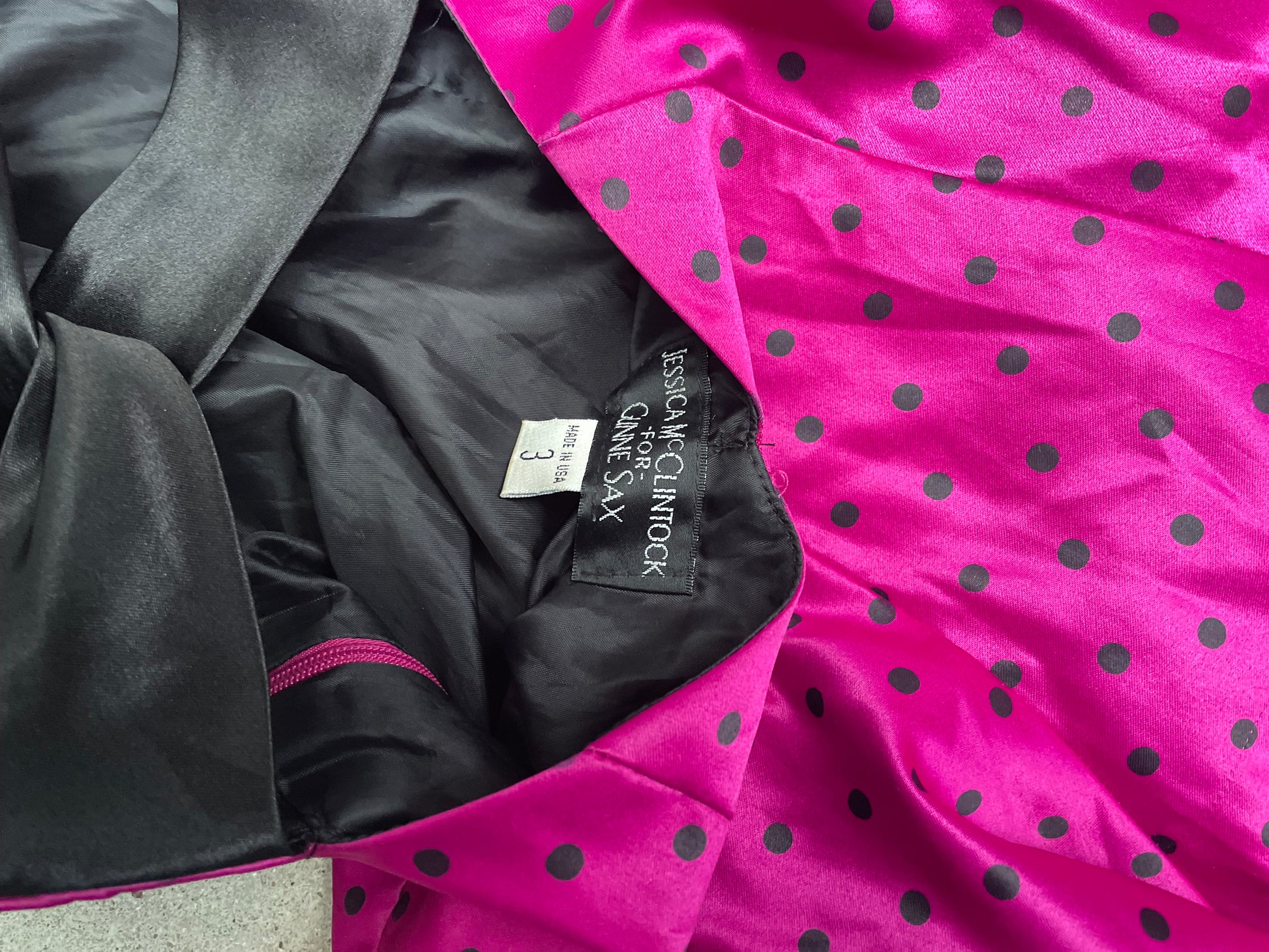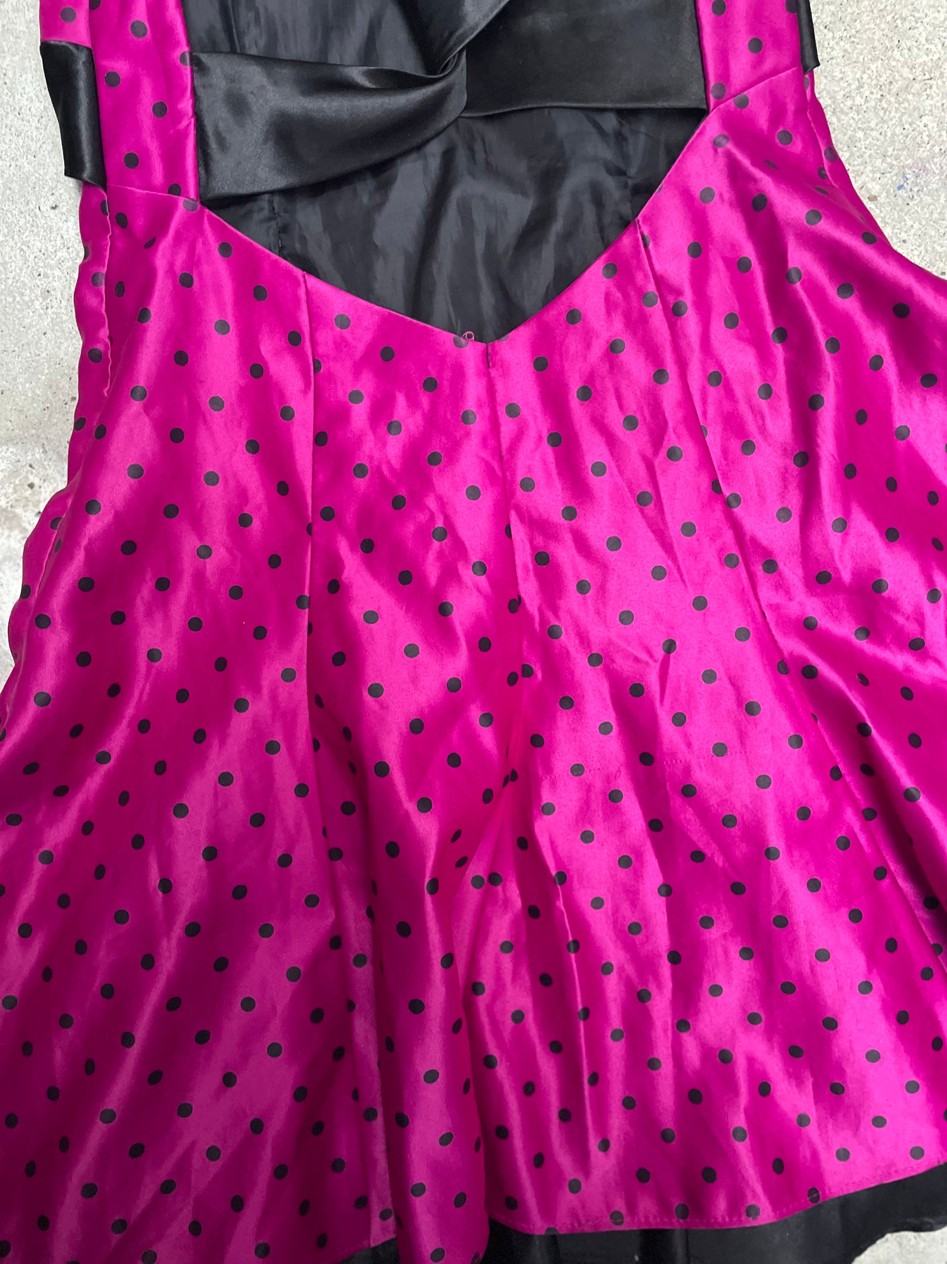 1980s era. Fuchsia pink with black polka dots. Soft satin with a fluid drape. Strapless bustier cut. Mini length.