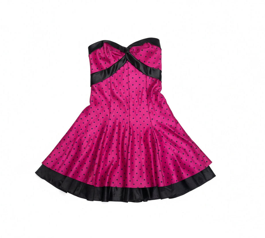 Vintage strapless mini dress by Gunne Sax from the 1980s. This rare piece features vibrant fuchsia pink satin with black polka dots, enhanced by contrasting black satin details. The strapless bodice beautifully highlights the bust, while the flared skirt adds movement and a distinctly feminine retro silhouette. Crossed satin panels at the front and back, along with the ruffled hem, emphasize the uniqueness and collectable nature of this dress.