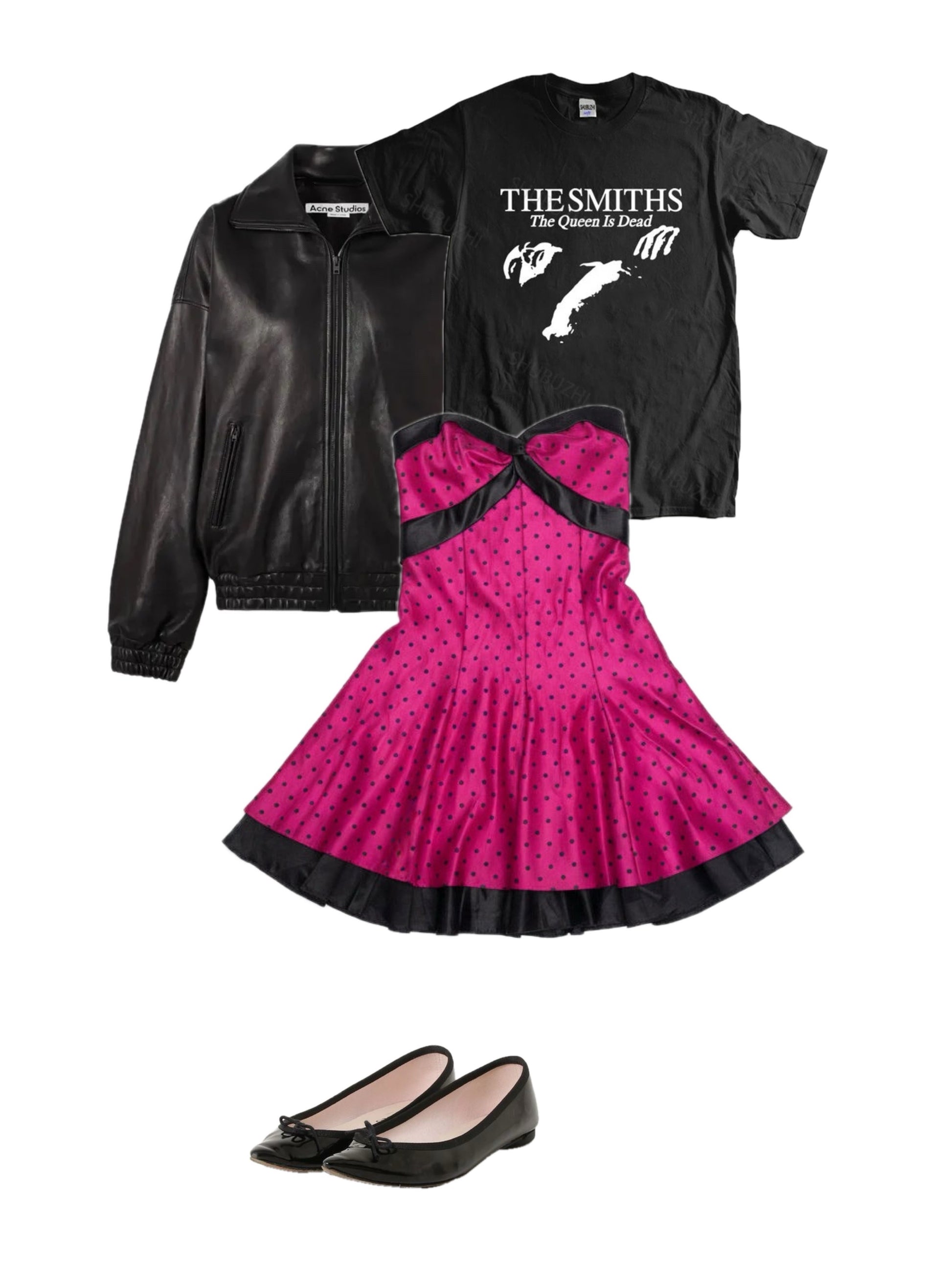 1980年代。カラーはフューシャピンク×ブラックドット。落ち感のあるサテン素材。ベアトップ仕様。ミニ丈。