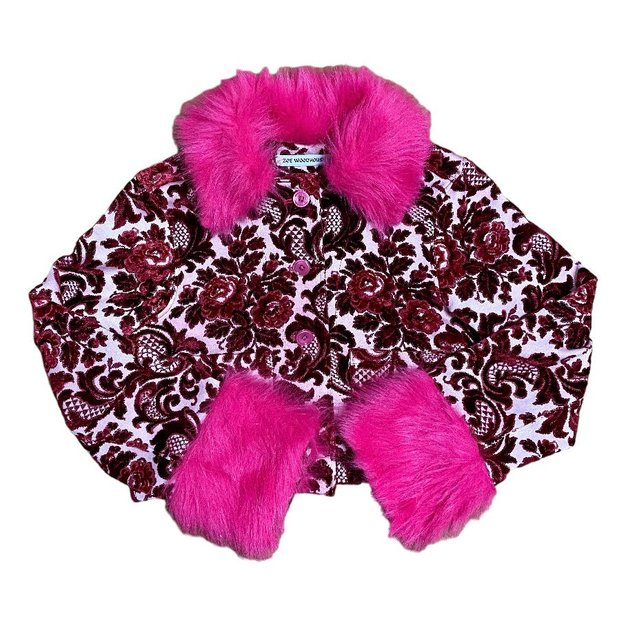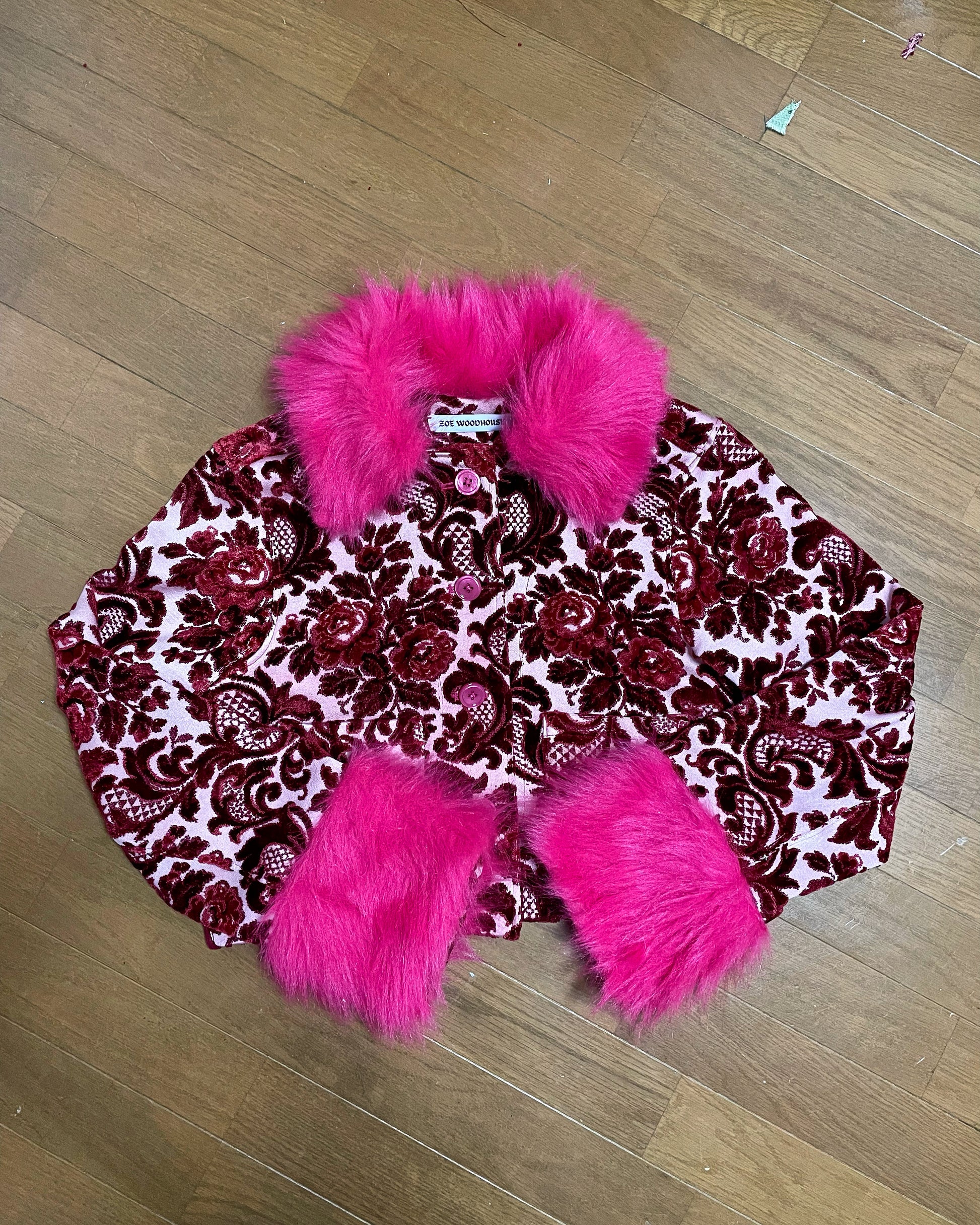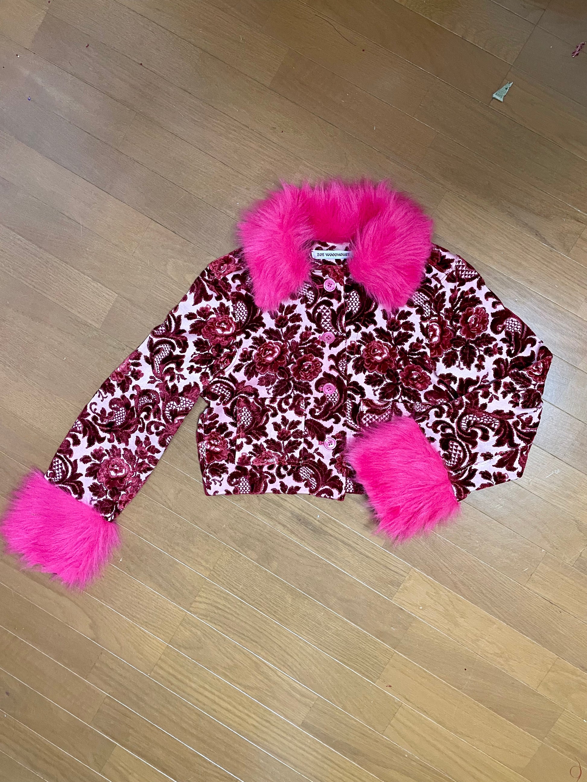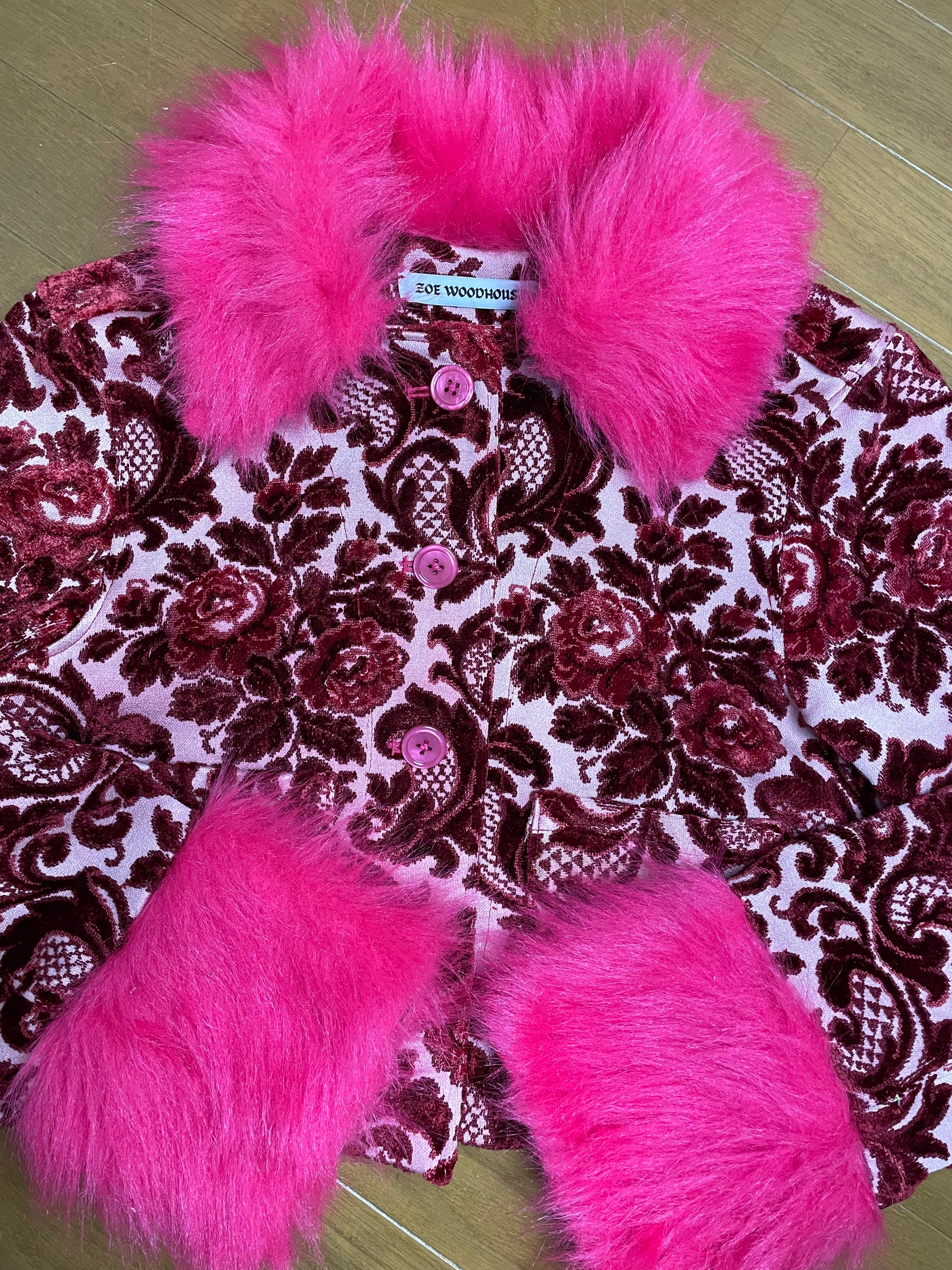 小さなピンクのフェイクファーカラーと袖口。四つのピンクのボタンで留めます。前面には二つのポケットがあります。シルエットはフィット感があり、長袖です。裏地はありません。