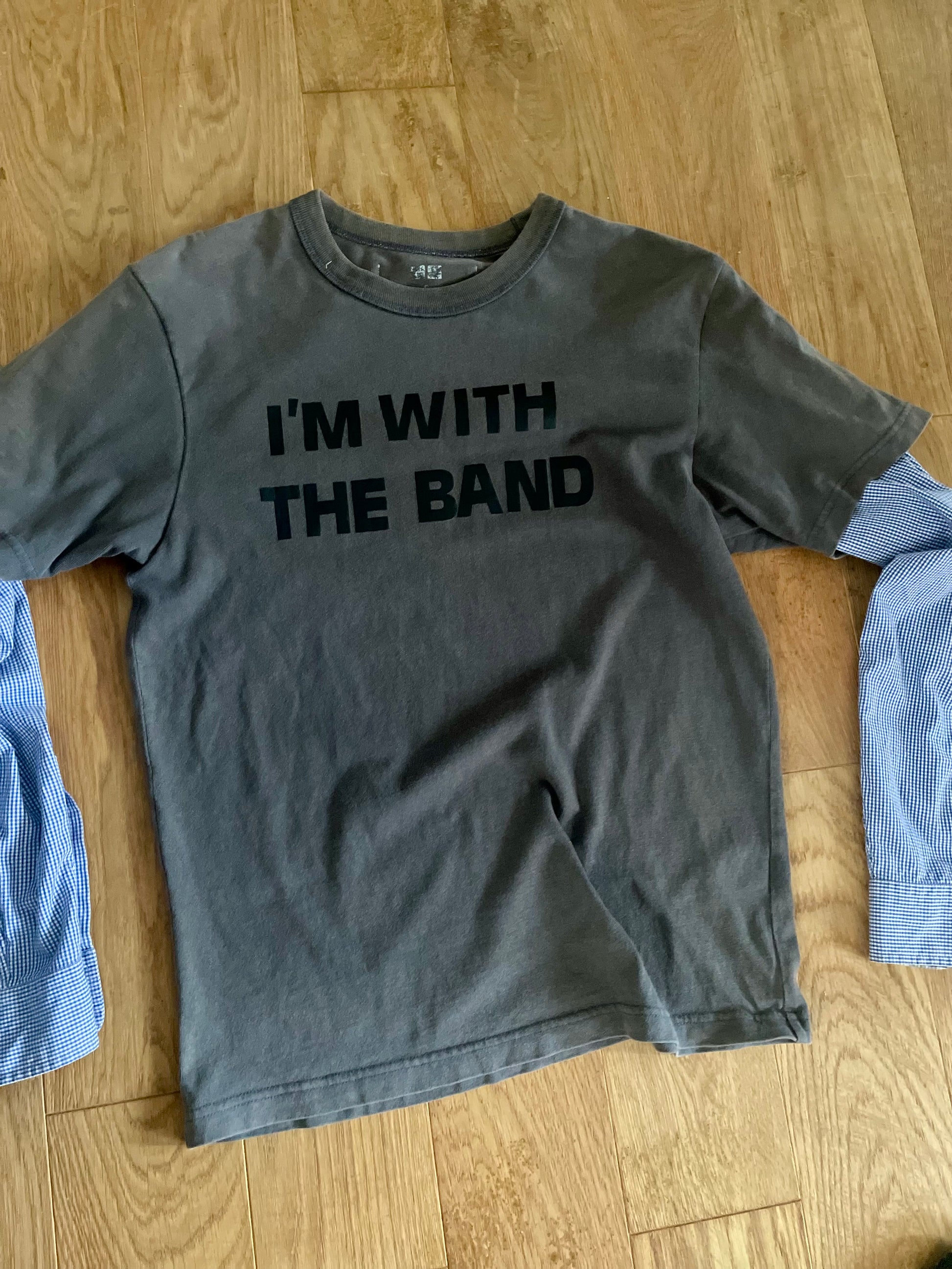 フロントには “I’M WITH THE BAND” のメッセージ。バンドの一員ではない可能性が高いのに、あえて着るというユーモアとアイロニーが効いた一枚です。