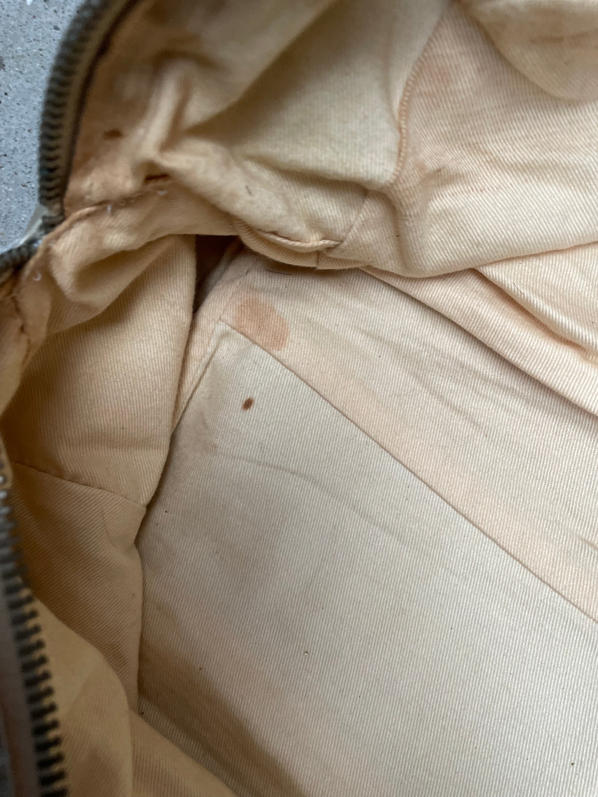 全体的に非常に良好なコンディションです。レザー部分に目立つ傷はありませんが、内側のライニングには数カ所シミが見られます。詳細は写真をご確認ください。こちらは中古品となりますので、新品同様の状態をお求めの方や細かな点が気になる方はご購入をお控えください。