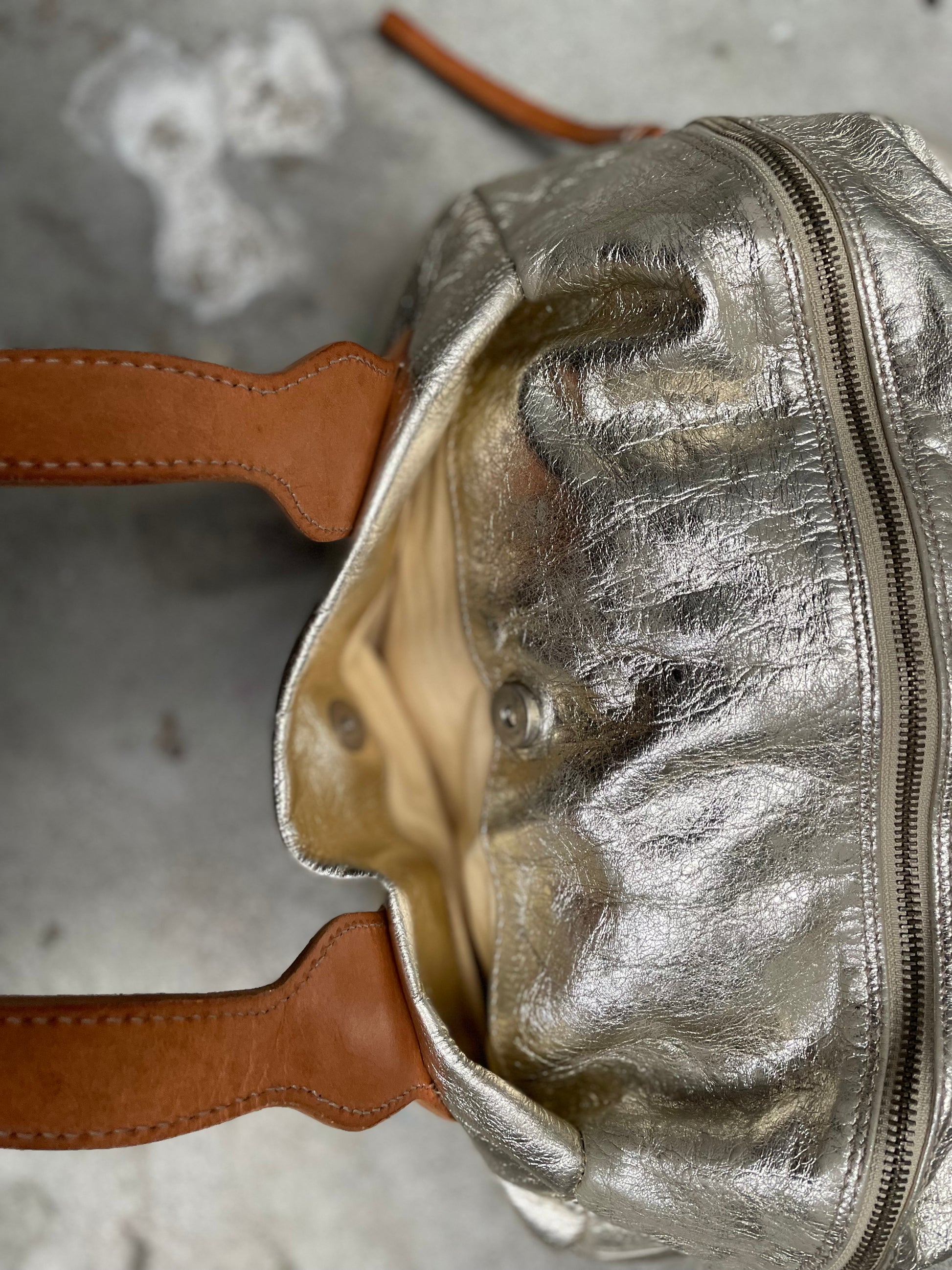 This bag is highly practical, featuring a spacious interior with multiple pockets that make everyday use easy and organized. The gold leather finish gives it a unique and highly desirable character, turning it into a true statement piece. It can be worn like a jewelry accessory to elevate a simple outfit. In summer, it pairs perfectly with denim, a white T-shirt, and gold sandals. In winter, it works beautifully with denim, a basic top, and leather boots, enhanced with a fur layer for a glamorous touch.