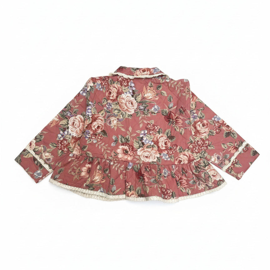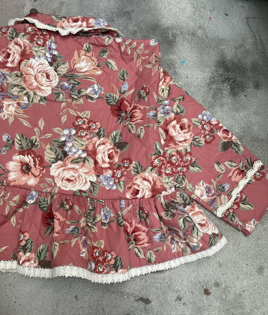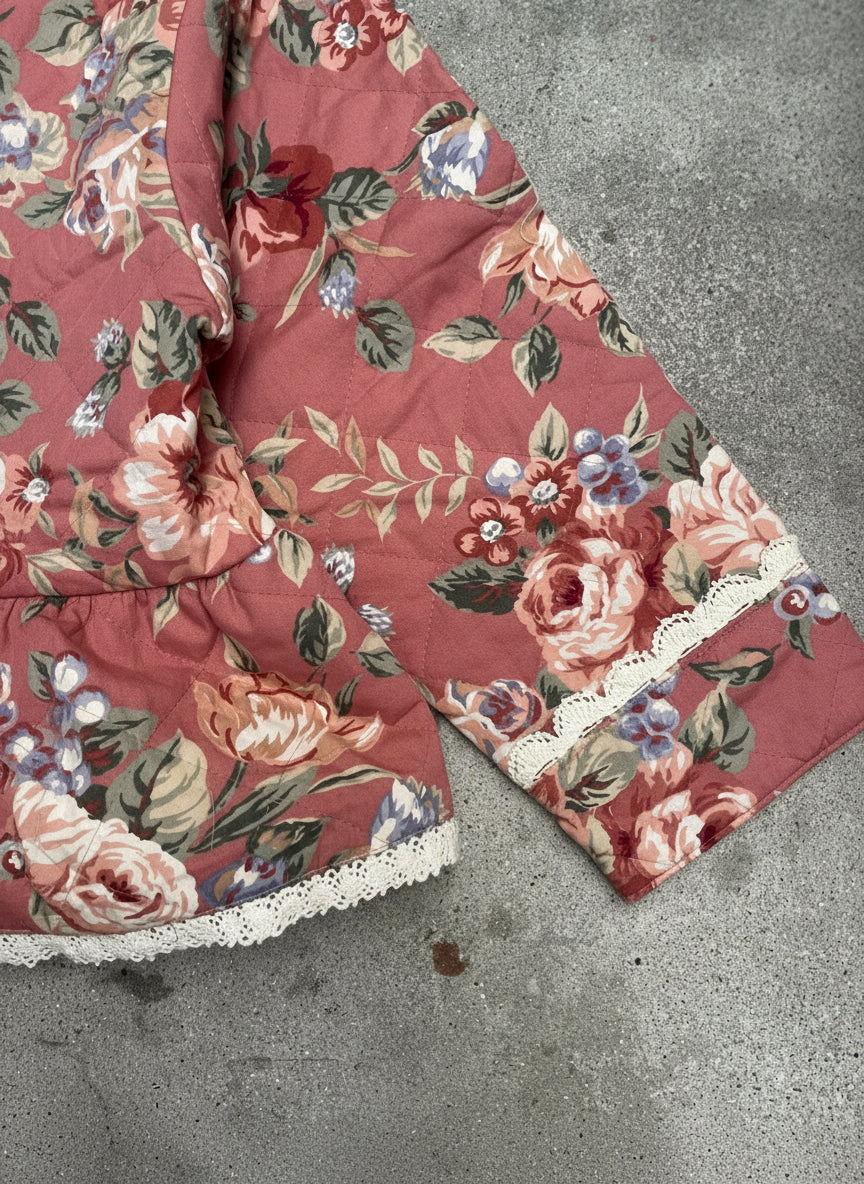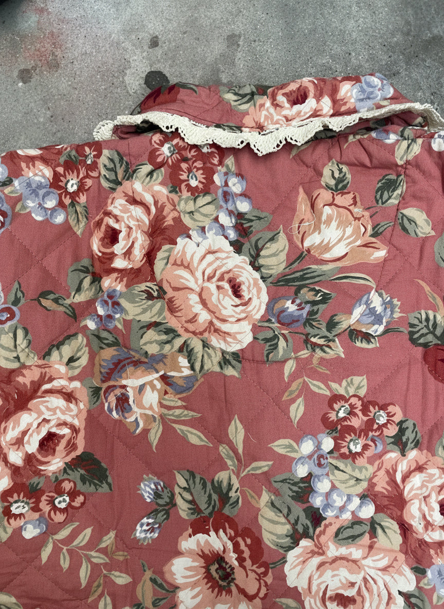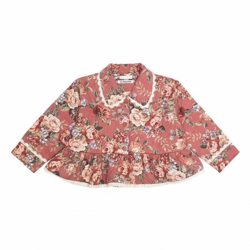 This Remake Quilted Jacket is a one-of-a-kind piece, handcrafted from a vintage dressing gown and transformed into a unique jacket. Its floral pattern and delicate lace trim bring a soft, feminine touch, while the lightweight, comfortable fabric makes it easy to pair with almost anything.