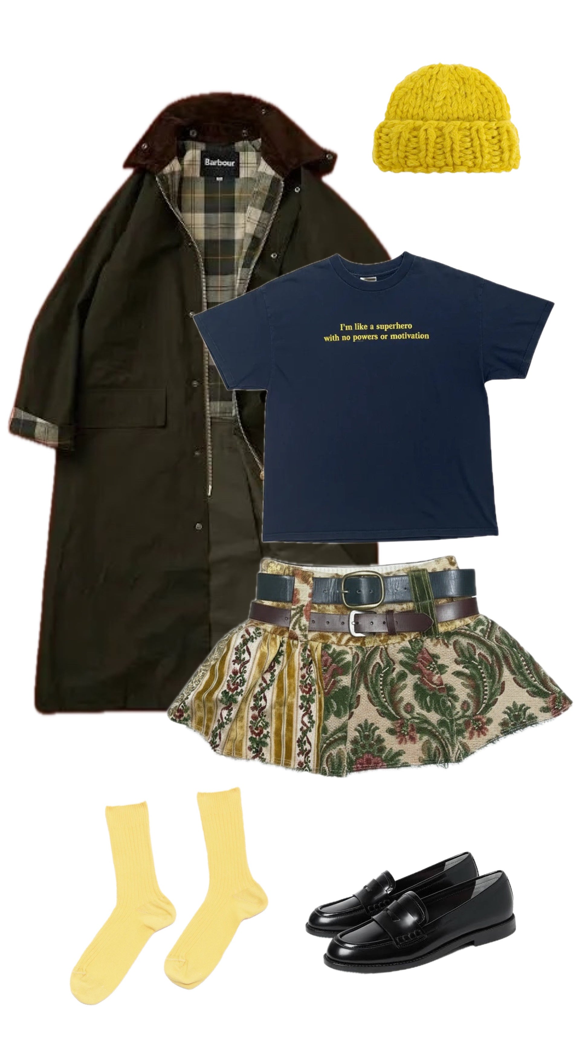 というメッセージプリント。スーパーヒーロー像をさりげなくひねった、自虐的で共感しやすいミニマルなユーモアがポイントです。